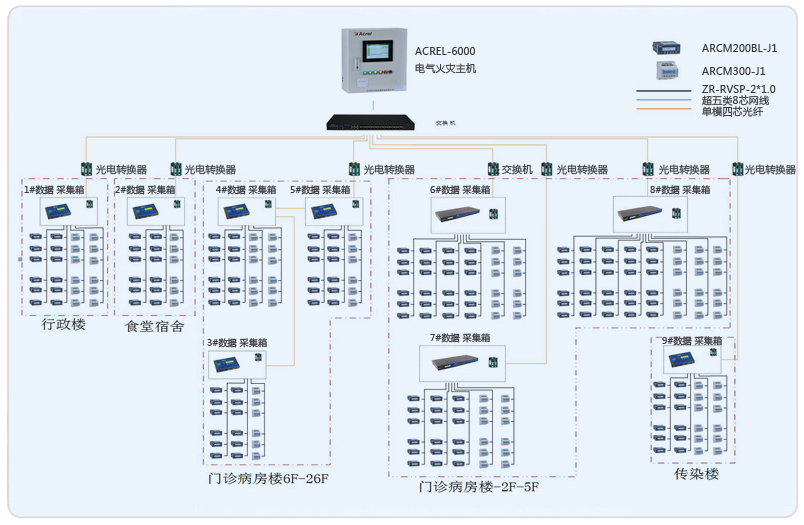 系統(tǒng)采用Acrel-6000電氣火災(zāi)監(jiān)控系統(tǒng),整個系統(tǒng)采用網(wǎng)絡(luò)分布式結(jié)構(gòu),監(jiān)控主機(jī)位于消控中心值班室門診一層,其余9個數(shù)據(jù)采集箱分布在行政樓、門診病房樓、食堂宿舍樓、感染樓,現(xiàn)場采用安科瑞ACRM系列漏電火災(zāi)儀表。所有監(jiān)控設(shè)備均通過屏蔽雙絞線至各自數(shù)據(jù)采集箱的通訊管理機(jī),再通過光電轉(zhuǎn)換器經(jīng)過光纖將數(shù)據(jù)傳輸至消控中心值班室門診一層,從而實(shí)現(xiàn)遠(yuǎn)程監(jiān)控。
