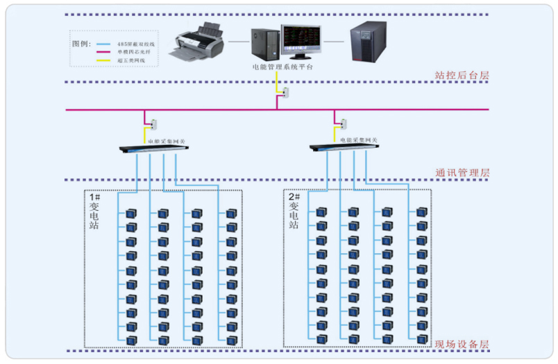 本項目主要是針對海南昌建逸海國際廣場內(nèi)的10KV/0.4KV的1#,2#變電所設計一套電力監(jiān)控系統(tǒng)。主要是采集10kV多功能網(wǎng)絡儀表電力參數(shù)、開關(guān)帶電指示儀開關(guān)狀態(tài)及0.4kV變電站多功能儀表的電參量,現(xiàn)場智能表計采用RS485總線組網(wǎng)接入電能管理系統(tǒng),系統(tǒng)主機安裝在1#變電所內(nèi)。