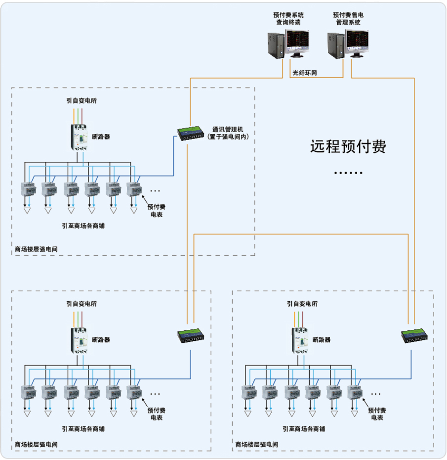 恒通順達(dá)廣場(chǎng)需要對(duì)商業(yè)部分85個(gè)商鋪?zhàn)鈶魧?shí)現(xiàn)預(yù)付費(fèi):先交費(fèi),后用電。為了方便業(yè)主充值和物業(yè)管理,要求使用遠(yuǎn)程預(yù)付費(fèi)方式,租戶在財(cái)務(wù)繳納電費(fèi),財(cái)務(wù)通過(guò)系統(tǒng)直接對(duì)儀表進(jìn)行遠(yuǎn)程充值,不需要租戶和物業(yè)接觸預(yù)付費(fèi)儀表,既保證人身安全,也保證系統(tǒng)安全。