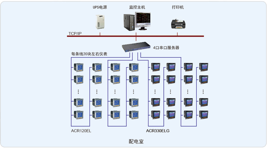 整個系統(tǒng)采用網(wǎng)絡(luò)分布式結(jié)構(gòu),監(jiān)控主機(jī)位于地下一層變電所值班室內(nèi),配電柜內(nèi)安裝有本公司ACR330ELH、ACR120EL儀表共計60多回路。仁恒河濱花園電力監(jiān)控系統(tǒng)現(xiàn)場共1個低壓配電室,配電室內(nèi)采用安科瑞ACR系列電力監(jiān)控儀表采集各回路的電流、電壓、電能等電參量,然后通過中間層采集設(shè)備網(wǎng)線到監(jiān)控室計算機(jī)上,實現(xiàn)遙測、遙信功能。