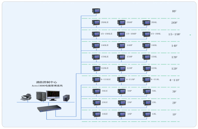 我司本項(xiàng)目承接其樓層部分電能管理系統(tǒng)搭建,完成對配電回路用電的實(shí)時監(jiān)控和管理。該項(xiàng)目進(jìn)出線回路均采用ACR多功能液晶顯示儀表,其是針對電力系統(tǒng)、公共設(shè)施、智能大廈的電力監(jiān)控需求而設(shè)計(jì)的網(wǎng)絡(luò)電力儀表,它能測量所有常規(guī)電力參數(shù),如:三相電壓、電流、有功功率、無功功率、功率因數(shù)、頻率、有功電度、無功電度。現(xiàn)場儀表以手拉手方式通過屏蔽雙絞線(RVVSP2*1.0)進(jìn)行通訊連接,每根總線連接智能儀表數(shù)量在20只左右,不同種類的智能裝置連接在不同的總線上,然后將數(shù)據(jù)上傳至數(shù)據(jù)采集器,進(jìn)而將數(shù)據(jù)上傳至當(dāng)?shù)乇O(jiān)控終端。