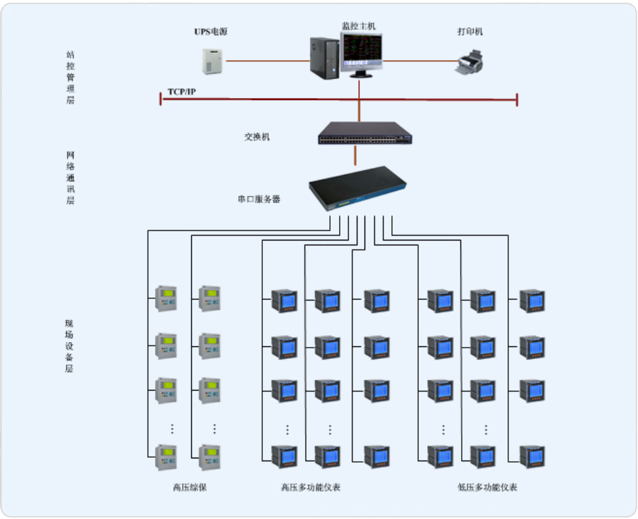 系統應通過多功能的電力監控裝置、通訊網絡和計算機軟件,實現醫院內供配電系統在運行過程中的數據采集、運行監視、事故預警、事故記錄和分析、電能質量檢測、三相不平衡監視、繼電保護等,完成醫院的安全供電、用電管理、設備管理和運行管理。系統由主控層、通訊管理層和現場控制層構成。系統要求盡量減少集中采集數據的裝置以保證系統的通訊可靠性。