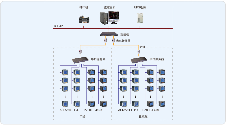 整個系統(tǒng)采用網(wǎng)絡分布式結(jié)構(gòu),監(jiān)控主機位于報告廳和外科樓的地下一層的動力中心中。該項目實現(xiàn)了哈醫(yī)大一院2個樓內(nèi)遠程精細化及時性報警。設計方案為2個樓內(nèi)的2個配電室,儀表數(shù)據(jù)通過485接口,MODBUS通訊協(xié)議經(jīng)數(shù)據(jù)采集器輸送到值班室主機。