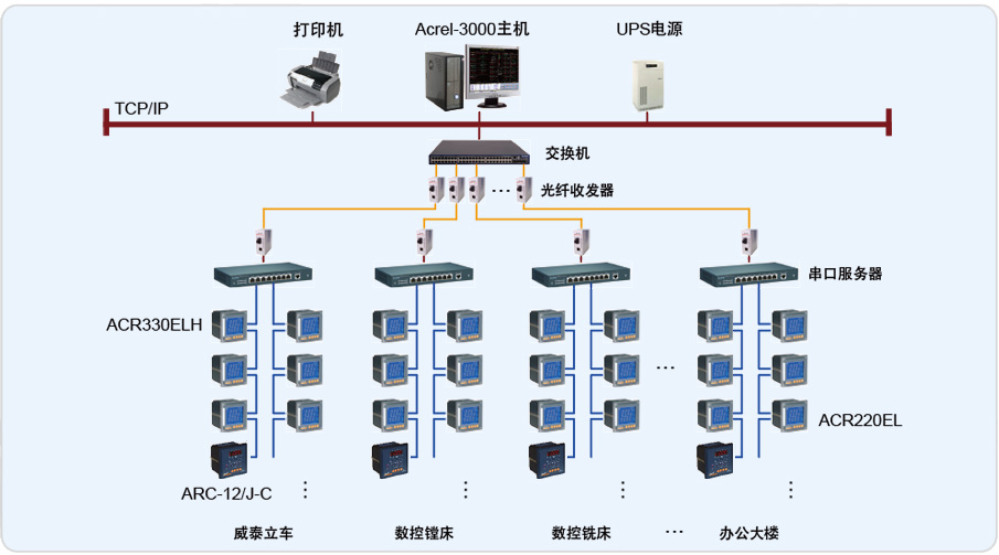 整個系統(tǒng)采用Acrel-3000型電能管理系統(tǒng),完成了對威泰立車公司、數(shù)控鏜床公司、數(shù)控銑床公司、武漢善福公司、武重鑄鍛公司、大件加工廠、中小件加工廠、辦公大樓8個單位13個配電室各回路的電能監(jiān)測和管理。其中低壓進線回路裝安科瑞ACR330ELH,低壓功率因數(shù)補償回路ARC-12/J-C型功率因數(shù)自動補償控制儀,其它回路配置ACR220EL網(wǎng)絡電力儀表。整個系統(tǒng)采用網(wǎng)絡分布式結構,監(jiān)控主機位于10KV監(jiān)控室內,系統(tǒng)采用開放的通訊協(xié)議,通過現(xiàn)場總線連接到通訊服務器 NPort5430 。13個配電室通過光纖組網(wǎng)與低壓配電系統(tǒng)相連,實現(xiàn)數(shù)據(jù)通訊功能。