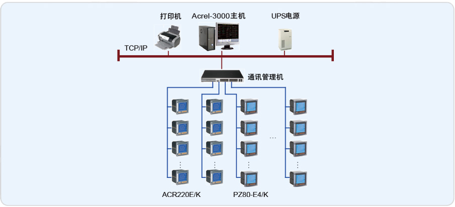 四川機(jī)械設(shè)計(jì)制造研究所主站層位于一層總值班室內(nèi),電力監(jiān)控系統(tǒng)的站控管理層設(shè)備具體包括:Acrel-2000電力監(jiān)控系統(tǒng)工控機(jī)一套、打印機(jī)、UPS。負(fù)責(zé)將通訊管理層上傳的數(shù)據(jù)解包,進(jìn)行集中管理和分析,執(zhí)行相關(guān)操作、以及整個(gè)變配電系統(tǒng)的整體監(jiān)控。網(wǎng)絡(luò)通訊層設(shè)備的選型主要從兩個(gè)方面考慮,一個(gè)是用戶(hù)需求,功能實(shí)現(xiàn)方面;二是根據(jù)現(xiàn)場(chǎng)情況,綜合項(xiàng)目的費(fèi)用來(lái)考慮的。針對(duì)這個(gè)項(xiàng)目來(lái)說(shuō)網(wǎng)絡(luò)通訊層設(shè)備采用性?xún)r(jià)比高的4口帶隔離的通訊管理機(jī)。兩路進(jìn)線選擇的是安科瑞生產(chǎn)的ACR220E/K網(wǎng)絡(luò)電力儀表;出線回路選擇的是安科瑞生產(chǎn)的PZ80-E4/K。