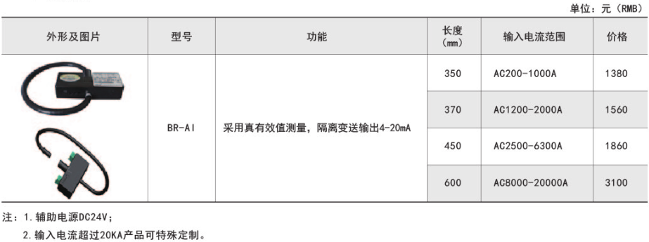 BR系列產(chǎn)品應(yīng)用電磁感應(yīng)原理,對(duì)電網(wǎng)中的交流大電流進(jìn)行實(shí)時(shí)測量,采用真有效值和線性補(bǔ)償技術(shù),將其隔離變換為標(biāo)準(zhǔn)的直流信號(hào)輸出。適用于冶金、電鍍、焊接等領(lǐng)域。具體型號(hào):BR-AI技術(shù)要求:輸入電流AC1...