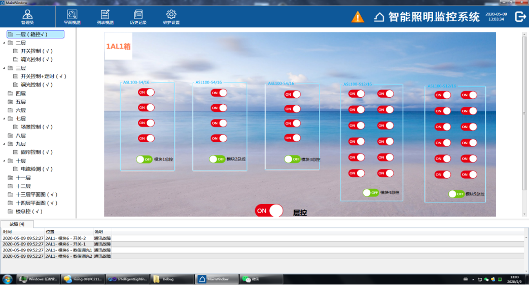 1)實時檢測并顯示各個模塊的在線狀態,反饋現場受控回路的開關狀態,監控界面按照樓層各分區的布局和回路列表來瀏覽。